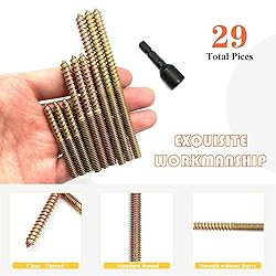 - Hanger Bolts Materials: Cabon Steel Treatment Process: color zinc-plated Thread Size:1/4-20‘’ Length: 2inch 10pcs, 3inch 10pcs, 4inch 8pcs Quantity: 28 Pcs Double Headed Bolts Hanger bolt driver Materials: Alloy-Steel Treatment Process: Black zinc-plated Thread Size:1/4-20‘’ Quantity: 1 Pcs These Hanger Bolts will be your best choice to assemble furniture and wood as a main construction material house. Double head screw for wooden joint, easy to install, durable, perfect for any DIY project or professional build. Tips: Suggest pairing the installation process with 1/4 caliber hanger bolt driver which will be easier and more efficient.