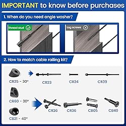 IMPORTANT to know before purchases: Black Angle beveled washer CR60 is ONLY compatible with 1/8" cable railing thread studs (Muzata CR26 CR36 CB05 CB40) . Please note that ONLY thread studs require angled washers while the lag screw doesn’t. For other models and compatibility, please check picture 2 to find the matched washers and cable railing kits you need For 25-35 degree stairs: This T316 stainless steel angled washer is specially designed to act as a filler between cable railing kit and end post on 25 30 35 degrees staircase. This item is suitable for 1/8" 5/32” 3/16" cable railing kit with outside diameter less than 3/8" in 25 30 35 degrees staircase cable railing system. The package includes: 10 packs of angle beveled washers Easy Installation and marine grade: This angle beveled washer is perfect for DIY a clean and neat cable railing project. It is easy to install, especially for beginners. This angled washer is made of T316 marine grade stainless steel, which has excellent durability and strong resistance to rust corrosion, and extreme weather Advice for constructing a system: To help you build a cost-effective black cable railing system more efficiently, we recommend the following product combinations from Muzata, including cable railing posts PS01 PS02,handrail HT10,cable railing kits CR26,angled beveled washer CR60,adhesive sleeves CR67,wheel protector sleeves CR90,wire rope WR17,socket wrench CT16,crimper and cutter CT01,handrail connector HA01 and HA02 Why Choose Us: MUZATA has helped millions of families with their cable railing projects during the past years. We believe that home renovation should be easy and affordable. So we work with every effort to provide quality products and professional service, to make Muzata a reliable brand