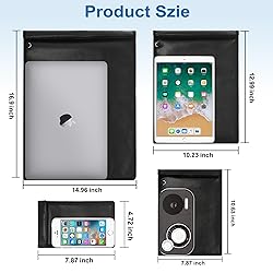 Complete Set for Secure Storage: Faraday bags includes four Faraday bags in various sizes—large (16.9" x 14.96"), laptop pouch (12.99" x 10.23"), medium pouch (10.63" x 7.87"), and phone pouch (7.87" x 4.72"); perfect for organizing and protecting multiple devices Advanced Signal Blocking: Faraday bags for phones multi-layer shielding blocks Wi-Fi, Bluetooth, GPS, RFID, and cellular signals; ideal for privacy protection, anti-tracking, and data security Fire-Resistant & Water-Resistant Material: Faraday bag made from silicone-coated fiberglass for added durability; helps protect sensitive electronics and personal items in case of fire, spills, or sudden weather changes Durable Design with Easy Closure: Faraday cage reinforced with Velcro closures and a flexible, foldable build; maintains shape after repeated use and fits easily into backpacks or luggage Ideal for Travel and Everyday Use: Faraday bag for phone lightweight and compact for use at home, in the office, in your car, or while traveling; also works as a tech organizer for cables, drives, and other accessories