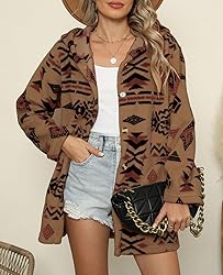 SELINK Womens Aztec Print Fleece Hoodie Jacket Button Down Shacket Casual Sherpa Coats Warm Outwear with Pockets