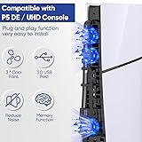 【NEWEST SPECIALLY FOR PS5 SILM CONSOLE】This horizontal cooling fan are perfect for 2023 PS5 Slim Disc and Digital Edition console. With 3-level high-speed mute fans, it efficiently ventilates hot air out of your console, ensuring optimal cooling and smooth performance, prolong its life. 【3-LEVEL FAN WITH COOL LED LIGHT】The cooling system for ps5 has 3 quiet and high-speed fans. Just simply press the button, you can switch effortlessly between low, medium, high, and off the settings. It features a memory function that turns on automatically next time after powering your console. You can also turn the fan on/off manually to save energy. The blue LED light indicates whether three cooling fans are running, making your console looks cool! 【EXTRA USB3.0 PORT】The Cooler fans for PS5 slim with the extended USB 3.0 port, allows for charging/connecting more USB devices, while effortlessly transferring data with a device. such as controllers, gamepads, keyboards, phones, tablets, and other USB devices. Not only enhances your gaming experience but also brings unparalleled convenience to your setting. 【SNAP-ON EASY INSTALLATION】It only takes several seconds to install the cooling fan on the for P5 Slim console and insert the USB connector, it will be firmly fixed on your console and does not take up space. Powered by USB port of PlayStation 5 Slim console, no additional adapters required! 【WHAT YOU GET & CUSTOMER SERVICE】 You will get 1x Cooler with RGB Light for PS5 Slim, 1x User Manual, for PlayStation 5 Slim cool fan. The cooling fan is a perfect Christmas gift for your friend and family. If you have any questions, We offer friendly customer service. Note: For your safety, please DON'T put your finger in the cooling fans!