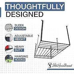6 Hanging Storage Hooks: The overhead storage system includes 6 hooks that attach below the shelf to hold bikes, extension cords, bags, paddles, garden hoses, tools, and more. Make the most of your garage storage with hanging ceiling storage. 4 X 8 Ft Garage Storage System: Utilize overhead storage space to store bins, luggage, tires, decoradtions, and more for ultimate garage organizing. Clear up floor space with this 96 in. x 48 in. x 40 in. ceiling storage rack. Heavy Duty Steel: Solid alloy steel frame supports up to 700 lbs for secure garage overhead storage. Flat, sqaured tubing shelf provides more stability than traditional wire shelves. Adjustable Height: Shelf distance from the ceiling can be set at a height of 24 inches to 40 inches to fit your space and your items stored. Build the rack to fit your needs. Flexible Installation: Ceiling mount brackets can be installed into ceiling joists aligned parallel or perpendicular with your 16" or 24" spaced garage ceiling joists. Quality hardware included for maximum strength.