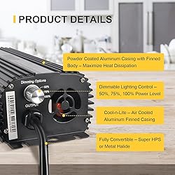 2023 New Technology: Built-in cooling fan and graduating fin designed to minimize ballast temperature. Advanced protection against short circuit, power surge, ignition failure, end-of bulb-life technology. Good compatibility: Automatically converts between HPS and MH light bulbs by micro-chip programming. Fast lamp ignition by lighting up the bulbs within 1-2 mins max. Stable voltage output ensures flicker free light. Operating parameter: Support dual voltage input 120V/240V. Dimmable options: 50%, 75%, 100%. Watt option: 150w/250w/400w/Super lumens (110%) More efficient: High frequency output results in less power loss, 30% more lumens than magnetic ballasts for improved yields. Package included: 1 x 400-watt digital dimmable electronic ballast, 1 x heavy-duty power cord, 1 x operating manual.