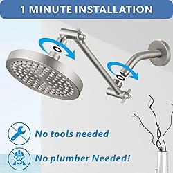 WONDERFUL WATER PRESSURE - The combination of pressure boosting and air-in technology leads to strong and high pressure, optimized for any water pressure, just like full and dynamic massage to your skin.Never worry about the low water pressure in your home. Our 6" shower heads always provide a consistent and POWERFUL rainfall shower, giving you a hotel spa-like shower experience. BRASS ADJUSTABLE SHOWER ARM - 11" Shower extension arm. Made from solid and solid brass. Not worry about breaking or leaking. Adjust the angle and height you want to achieve a better rainfall effect. WATER SAVING - The kit also includes a 2.5 GPM and california compliant 1.8 GPM flow restrictor, helps reduce water pressure, no more wasting hot water while getting soaped up. So you can save on your water heater bill or enjoy longer hot showers. NO HASSLE TOOL-LESS 1-MIN INSTALLATION - A good choice for bathroom showerheads replacement,plumbers tape included . G1/2” threads connect to any universal shower arm. BRAND PROFESSIONALISM AND ADVANTAGE - At Voolan, we strive to deliver quality shower heads high pressure products to our customers because we believe in "Transforming your shower experience" and so does our dedicated Customer Happiness team available every day of the week to answer any of your questions.