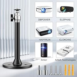 【UNIVERSAL MINI PROJECTOR MOUNT】Universal projector mount with 2 thread adapters offering 3 different sizes of screw threads (0.153/0.232/ 1/4" (3.9/5.9/6.35mm) to compatibility for office, home, or classroom 【STABILITY】This mini wall mount projector bracket is made of aluminum alloy, and the tube is designed to be thicker. It is suitable for a mini projector and camera. supports mini projectors up to 4.4 lbs/2kg 【EASY TO ADJUST】The projector mount can be adjustable, it can rotate 360° and tilted 90° with a knob to fix the angle easily. The length of the projector holder is 6.9 in /17.5 cm 【EASY TO INSTALL】The mini projector mount ceiling mount is easy to install. NOTE: This projector screen ceiling mount does NOT support the vaulted ceiling and regular drywall. It is important to ensure that your projector has a tripod screw hole for compatibility. Some concerns have been raised about the screws breaking inside the projector, so caution is advised PS: The image is only for reference, the mini projector is not include