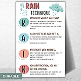 Mindfulness Tool - The Rain Technique poster serves as a visual guide for the mindfulness practice of recognizing, Allowing, Investigating, and nurturing, helping individuals navigate through emotions and stress with clarity and compassion. High-Quality Lamination - Our 11x17 Rain Technique poster is fully laminated, providing a durable, tear-resistant, and waterproof finish that's ideal for frequent reference in high-traffic areas like therapy centers, classrooms, or offices. Clear Visual Aid - With clear, easy-to-follow steps, this poster breaks down the Rain Technique into an approachable format, making it an excellent resource for therapists, counselors, and educators promoting emotional intelligence. Soothing Design - The calming colors and imagery on the poster are specifically chosen to evoke a sense of tranquility and focus, enhancing the therapeutic process of the Rain Technique for viewers. Educational and Decorative - Not only is this poster educational, but it also adds a decorative touch to any space. Its professional design makes it suitable for display in health clinics, wellness centers, meditation spaces, or even home offices.