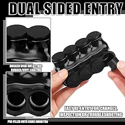 Durable Material and Design: made from strong aluminum, the 4 port wire connector is not only reliable but highly resistant to chemical and UV exposure; Its design includes one side wire inlet sized to accommodate a wide variety of cables, from 250 MCM to 6 AWG, providing flexibility in its usage and making it a versatile tool for all your connection needs Secure and Heat Resistant: these black insulated connectors come pre filled with oxide inhibitors, making them capable of withstanding a temperature range between -49 to 194 F; This feature ensures they function reliably even in extreme weather conditions, maintaining your connections secure Comprehensive and Versatile Package: every package includes 2 multi cable connectors; Each connector is designed for compatibility with both aluminum and copper wires, giving you greater flexibility in terms of application and the types of wires you can use Generous Wire Gauge Port and Size: our insulated multi tap connector is designed with a large wire gauge port with range options, accepting a 250MCM-6AWG multi cable connector with 5/16" hex socket slot; Its compact size of 3.98 x 2.22 x 1.91 inches ensures it is not only portable but also easy to use Safety Certified and Reliable: with a capacity of 600 volts and certified by UL Certification and CSA, our electric power connector is a safe and reliable tool for your connectivity needs; Its high dielectric strength plastisol, black cover, and removable plugs offer you the reliability you can count on