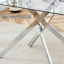Modern and Simple: The generous design of this glass dining room table creates an open and airy expression. Durable steel construction with criss-crossed legs gives this table a sleek look, and adds an elegant touch to the dining area, often suiting styles like modern, industrial decor. Architectural Pedestal Base: Supported by sturdy chrome steel legs in a criss-crossed design and finished in chrome silver. The frame with an open tubular construction not only increase the width of table legs to improve solidity. Ultra Clear Tempered Glass: This silver glass dining table features an 8mm thick safety tempered glass top for durability and a crystal tabletop that always shines. Maintenance is a breeze - they are stain-resistant and can be wiped down with a damp cloth for daily use. Ideal for Small Space: A glass kitchen table is an excellent choice for those looking to balance style and practicalit. Perfectly accommodates 4-6 people. The transparent glass tabletop enhances visual space, which makes it a great choice for small spaces dining room apartments. Well-packaged & After-sales: Each glass table is drop-tested and all edges are protected to avoid breakage or damage before it arrives at their destination. If you receive the product damaged or use it unsatisfactorily. Please contact us by email, our will help you resolve the issue in an earnest manner.