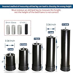 Different adjustable bed frames have different bolt threads, so we provide 4 thread types: M8, M10, 5/16, and 3/8, with diameters of 8mm and 10mm. If you remove the old bed feet and find the thread diameter is 12mm, you must search for and purchase at the store: Benbuoo M12 bed replacement screws. This product features a fixed height that cannot be adjusted, designed to replace adjustable frame beds. Unlike the design with easily loosening top-end reducing bolts, it employs more secure anti-slip bolts to firmly secure the top structure, preventing loosening. Package includes 4 bed Legs that you need to assemble yourself, as well as a wrench tool for easy replacement and installation, preventing you from having to go to a distant hardware store for parts. You must determine the height you need before purchasing, the replacement may take some time, but overall it is worth effective, if there are missing parts, you can contact us, we will take care of it for you. This height is 4 inches, if you need shorter, please don't choose it. Any questions such as missing parts,let me know and we will provide you with satisfactory service.