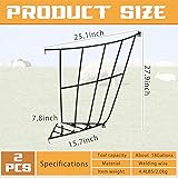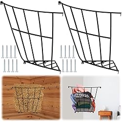 High Capacity and Convenient Storage: our package comes in 2 pieces corner hay rack; Measuring approximately 25.1 inches at the top opening, 15.7 inches at the bottom, 27.9 inches in height, and 7.87 inches/ 20 cm in depth, these racks offer ample space for hay; Its ideal size can hold large amounts of hay for day long feeding Space Efficient Corner Design: the horse hay feeder has a depth of about 7.87 inches, which makes it conveniently fit in a corner; Ideal for utilizing space on the wall and reducing clutter, these racks ensure your floor keeps clean and unobstructed Durability in Material: crafted using quality metal, the wall mounted hay rack holder promises long term performance and resilience; Its black surface not only adds a sleek touch but also enhances its resistance to wear and tear; The circular edge can keep livestock injury, and can be applied indoors and outdoors for long term use Keep from Waste: goat hay holder ensures that your hay remains clean and away from the ground, reducing waste and chaos; With simple assembly, you can easily have an ideal hay feeder, ensuring that your livestock gets the most out of every feed; Plus, their versatility extends its use beyond just horses, making it a nice addition to sheep sheds, courtyards, farms and more Promoting Healthy Digestion: the mesh design of the wall mount hay rack allows for slow feeding, preventing rapid eating that can cause indigestion; Ensuring your livestock maintain a healthier diet, these racks are a must have for someone looking to promote the well being of their animals