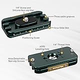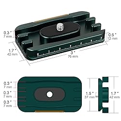 Reliable Quality: 6061-T6 aluminum alloy material for this Arca camera port cable protection, advanced CNC precision provide precise dimension to fit perfectly, long time anodized treatment for higher durability, screws are stainless steel; The exquisite appearance and excellent workmanship are much better than similar products Functional Design: Keeping your cable or cord anchored to your camera body with a 1/4”-20 thread mount that protects the sensitive data port of your camera from unnecessary damage; And the plate has two drop-proof screw at the bottom to help prevent the camera and plate from sliding all the way forward or backward out of the ball head, in case the head's clamp is inadvertently left loose Protection Function: With non-slip friction pads to prevent camera twist, the lightweight and extremely durable Arca cable clamp provides multiple channels that accept thick, medium, or thin cables; This cable clamp is used to fix the cables when you are in tether shooting; It protect the socket of the camera and ensure it wouldn't been interrupted by cable loosening Switch Quickly: Arca locks your tethered cable into place, the integrated Arca-style tripod mount makes it simple to attach to arca-compatible tripods; The measurement scales helps position your camera in small increments, and also allow you to keep balancing position for your camera; Save time when mounting or detaching your DSLR or mirrorless camera Application: There is two 1/4" & four ARRI locating threaded screw on the plate to connect with your quick release plate for tripod; This cable clamp is also used for DSLR video rigs, camera armor cage, follow focus; Keeps tether cables connected and secured to camera; Protects expensive camera ports from damage; Works with cameras, cages and other video rigs with 1/4" screw holes Compatibility: Out of the box camera quick release plate incorporates a 1.5" dovetail fully compatible with the Arca-Swiss standard dovetail quick-release clamps and heads fits the Arca-type quick release element of ball head models; The maximum size is about 76x42x12 mm, weight about 65 g/0.14 lb; Package Includes: 1 x camera cable lock clamp, 1x hex wrench