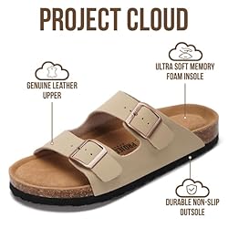 100% G𝗲𝗻𝘂𝗶𝗻𝗲 L𝗲a𝘁𝗵𝗲𝗿 U𝗽𝗽𝗲𝗿: Experience the perfect blend of style and comfort with Project Cloud's womens sandals. Made with 100% genuine leather, these sandals women offer a premium quality that guarantees durability and long-lasting use, ideal as women’s sandals perfect Valentine’s Day gift for her. M𝗲𝗺𝗼𝗿𝘆 F𝗼a𝗺 I𝗻𝘀𝗼𝗹𝗲 & Na𝘁𝘂𝗿a𝗹 C𝗼𝗿𝗸 F𝗼𝗼𝘁𝗯𝗲𝗱: These sandals women are designed for superior comfort and support, the plush memory foam insole cushions every step while the natural cork footbed provides lightweight stability, flexibility, and all-day arch support for women sandals. C𝗼𝗺𝗳𝗼𝗿𝘁a𝗯𝗹𝗲 F𝗶𝘁: The adjustable two straps of these women's flat sandals provide a secure and custom fit, enhancing comfort for all-day wear. They feature adjustable two straps for a personalized fit that provides exceptional support. O𝗽𝗲𝗻-T𝗼𝗲 D𝗲𝘀𝗶𝗴𝗻: These sandals women showcase an open-toe design, perfect for a comfortable summer experience. The adjustable two straps allow for a perfect fit, enhancing comfort. Made with 100% genuine leather, these slides are not only stylish but also durable. D𝘂𝗿a𝗯𝗹𝗲 E𝘃a O𝘂𝘁𝘀𝗼𝗹𝗲: These slip-on slippers feature an EVA outsole, offering great traction and resistance to wear, perfect for both indoor and outdoor use.
