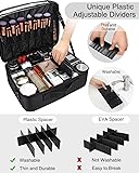 High Quality Material: This eatra large makeup case is made of high-quality oxford material and waterproof lining, durable and easy to clean. The sturdy shell design can better protect your cosmetics. Equipped with a zipper with a lock to ensure that your items will not fall out. More Convenient and Multi Usage: Lockable metal zipper and backpack let you set train case on the trolley and never worry about the weight when to travel around; Adjustable straps let you use it as should bag. Unique Design Plastic Adjustable Dividers: Washable and easy-to-clean plastic dividers. The design of the detachable partition provides unlimited possibilities for your storage space, you can adjust it according to the size of the stored items. Plastic partitions can effectively keep cosmetics neat and orderly. Roomy And Multi-Compartments: The extra large makeup case has 2 specific layers. First layer: 3 elastic pockets and 2 zippered mesh pockets for hair curler hair straightener, makeup brush, makeup tools, etc. One large zippered mesh bag for the eyeshadow palette. Second layer: 12 elastic makeup brush slots with a plastic cover and hold about 40 pcs brushes give all your brushes a safe "home". (Excluded makeup accessories) Largest Among Similar Makeup Train Case: Multi-Functional makeup artist box perfect for any occasion, It can be used as a Personal makeup case organizer, professional makeup artist box, as a handbag with a belt to carry on the shoulder, and as makeup trolley case.