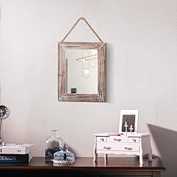 RUSTIC WOOD WALL MIRROR FRAME: Rustic wood frame with natural texture in the wood frame, Simple & weathered wood color vintage farmhouse style, and high-quality mirror materials, This cute rectangular wall mirror is minimalist & country-chic. PERFECT SIZE FOR DECOR: Our rectangle farmhouse wall mirror frame size is 16 x 12 inches, we are good for wall mounting display, and we have hemp rope for this wall mirror, The wood mirror frame is suitable for installation in the bathroom, bedroom, and living room, dresser, cabinets, porch, entryway, etc. HIGH QUALITY: This wall mirror frame is all handmade and made of premium natural wood material which features no odor and is non-toxic, it has fine workmanship, clear definition glass mirror with 4 fixed iron pieces is reinforced with solid backing for added stability, durable and reliable, vertical wall decor. MULTIPLE DECORATION: This wood wall mirror is a great gift for family, friends, mother, girlfriend, or woman, it's perfect for decor for multiple, such as bathroom, office, home bedroom, cafe, living room, dining room, bedroom, kitchen, corridors, porches, stairs, dressing room, vanity. PERFECT GIFT FOR SURPRISE: This wooden wall mirror is unique farmhouse style, great for decorating your house, This vintage-inspired look to your home decor with this natural-looking wood frame. This cute wooden hanging wall mirror will be a great gift for family or friends to deliver a surprise at a housewarming, birthday, wedding, Anniversary, Mother's Day, New Year, or Christmas.
