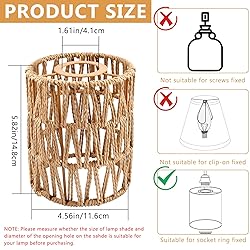 - Note: Please make sure the size of the opening on the top of the lamp shade if suit your lighting fixtures before purchasing. These hanging rattan shades can be only used for the light fixture, which is needed to fixed by the socket ring. Let’s get those beautiful wicker lamp shades, bringing rich bohemian style and modern navigation style to your warming home. Package: 6 Pack Rattan Lamp Shades Specifications: Material: Rattan and Metal Color: Brown Size: 5.9×4.5inch IMPORTANT: 1. Please check the package if it is in a good condition. 2. Our all items are come with 180 days free after-sale service, if you do have any questions please feel free to contact us!