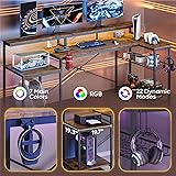 Bestier 71.5 inch Computer Desk with Power Outlets, LED Large Home Office Desk with Monitor Stand, L Shaped Corner Desk with Printer Stand Adjustable Shelf, Cup Holder & Headset Hooks, Brown