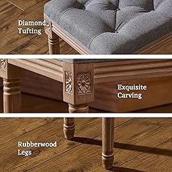 FUNCTIONAL ART: This 16 by 12 inch vintage stool by Vonluce marries modern strength and French country flair, characterized by its brushed wood, delicate carvings, and elegant muted colors to complement any home decor. GRACEFUL ACCENTS: The thick 2 layer padding consists of 0.8" memory foam and 1.2" high-density foam, combined with breathable linen upholstery and classic diamond tufting to offer lasting comfort with an inviting look for you and your guests. SUPERIOR QUALITY: Our durable ottoman stool’s weathered rubberwood frame and legs with corner reinforcements offer exceptional strength that holds up to 330 pounds. GREAT VERSATILITY: This 18.5" high multipurpose stool is perfect for foyers and entryways, but also makes a stylish piano stool, handy dressing or vanity stool, or provides extra seating in your dining or living room. SIMPLE SETUP: Vonluce’s intuitive design, clear instructions, and preinstalled nuts guide quick and easy assembly of this button tufted stool, simply align the legs, tighten their bolts, and enjoy!