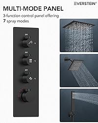 - Step into a world of unparalleled luxury with EVERSTEIN's Ceiling Mount Shower Faucet System. Transform your daily routine with a stunning 12" rainfall showerhead, backlit by an enchanting spectrum of 64 LED colors to create a truly personalized ambiance. Enjoy the flexibility of a 59" handheld shower faucet, designed to reach those difficult spots effortlessly or to pamper your beloved pets. Additionally, our 6" small wall-mounted showerhead provides focused cleansing and can rotate and tilt for a customized showering experience. Our brass thermostatic valve ensures a consistently warm and safe temperature, offering you peace of mind with every shower. With the ability to run all functions simultaneously—the 12" rainfall shower head, handheld shower, and 6" additional shower head—our system guarantees unmatched performance and versatility. Elevate each moment under the water with EVERSTEIN.