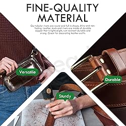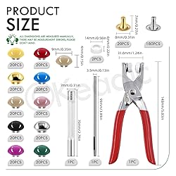 - Keadic 404Pcs 9mm Leather Rivets Assortment Set with Setting Tools, 10 Colors Double Round Cap Leathercraft Metal Studs for Shoes Belts PKeadic 405Pcs 9mm Leather Rivets Assortment Set with Setting Tools, 10 Colors Double Round Cap Leathercraft Metal Studs for Shoes Belts Purse Handbags DIY ◆ Product Specification: √ Material: Copper & Carbon Steel √ Color: silver, gold, black, red, yellow, pink, apricot, blue, purple, green √ Product Size: → Cap studs --- 9mm/ 0.35inch in upper diameter, 4mm/ 0.15inch in height → Tubular studs --- 8mm/ 0.31inch in base diameter, 7mm/ 0.27inch in height → Rubber ring --- 14mm/0.55inch in diameter, 6mm/ 0.23inch in height → Pliers --- 148mm/ 5.83inch in height, 31.6mm/1.24inch in width → 7mm punching tool --- 7mm/ 0.27inch in diameter, 70mm/2.76inch in length → 2mm hole punch --- 2mm/0.08inch in diameter, 99mm/3.89inch in length ◆ Product Feature: √ 2Pcs Rubber Rings to Replace: → When the white rubber rings on the pliers is damaged, there are new 2 pieces in the package you can replace. √ Premium Punching Tools: → Our punching tools are made of premium metal, specifically non-rusting, corrosion-resistant, and will not be deformed. → Smooth edges of the punching tool make perfect holes in leather. √ Easy to Organize: → All rivets are neatly stored in a transparent plastic box, and the rivets of each color are packed in different places. → You don't worry about mixing them up, when you vigorously shake the storage boxes. ◆ Package Contain: 20pcs 9mm/ 0.35inch silver cap studs 20pcs 9mm/ 0.35inch gold cap studs 20pcs 9mm/ 0.35inch black cap studs 20pcs 9mm/ 0.35inch red cap studs 20pcs 9mm/ 0.35inch yellow cap studs 20pcs 9mm/ 0.35inch pink cap studs 20pcs 9mm/ 0.35inch apricot cap studs 20pcs 9mm/ 0.35inch blue cap studs 20pcs 9mm/ 0.35inch purple cap studs 20pcs 9mm/ 0.35inch green cap studs 20pcs gold metal tubular studs 180pcs silver metal tubular rivets 1pc punching pliers 1pc 2mm hole punch 1pc 7mm punching tool 2pcs rubber rings 405pcs in total urse Handbags DIY