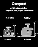 - SiFENE's Gen 2 Slow Juicer offers non-stop, uninterrupted juicing. Its innovative dual-chute system allows for simultaneous feeding and pushing of ingredients, delivering maximum yield in record time. The dual feed chute design enhances efficiency, enabling quick and effective juicing of fruits and vegetables. This cold press juicer from SiFENE extracts the maximum nutrients, vitamins, and flavor from minimum produce, ensuring freshness with a low-speed, high-yield process. The smart juice cap and safe operation at 110 RPMs with overheat protection mechanisms make juicing convenient and safe. Its compact design fits easily under cabinets and cleaning is a breeze, thanks to removable parts and low pulp residues. The juicer's easy assembly allows for quick setup and cleaning. For heavy users, SiFENE recommends our Dual Mouth MAX model (B0BWYBRGNJ/B0CFYFN3C5) which features a powerful motor and extra-large feed chute. At SiFENE, we stand behind our products with lifelong customer service and a satisfaction guarantee. Contact us at any time for a replacement or refund if you're not completely satisfied