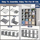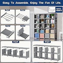 【More Choices】: We have various styles of cube shelves, such as 4/5/6/9/10/12/15/16/18/20grid black or gray or white cube shelves for you to choose,and fit different styles and sizes 【DIY As You Want】: Use your imagination, this cube structure can be composed into various shapes, such as bookshelves, storage racks, wardrobe organizers, each shape can make your layout more flexible and diverse 【Store As You Like】: Our storage shelves can accommodate different kinds of items as you like, such as books、clothes、 toys、 picture frames and more.There is a hook on the side of the bookshelf, which can store hats or umbrellas.But we don't recommend that you place items over 30 lbs. 【Easy To Assemble】: These modules are in a cubic structure, which is more convenient for you to assemble. At the same time, we have a matching installation guide, so you don't have to worry about being confused after receiving it. 【Suitable For Different Scenarios】:The application scene of this bookshelf is not fixed, you can decide according to your personal preference,such as study room, living room, bedroom, office and more