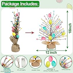 2 Pack Easter Egg Tabletop Tree Decorations: Package includes: 2 pack Easter yellow/blue/pink 3D Easter egg-shaped tabletop tree; Size: 19 in*12 in (H*W), base: 3.5 *2 in (W*H); Note: DIY assembly required to install string lights on tree Easter Holiday Decoration: Each Easter egg tree decoration has 8 pcs 3D Easter egg(3 pink, 3 yellow,2blue);72 Berry (24 yellow,24 blue, 24 pink );96 Dots(24 yellow, 24 blue, 48 pink); Making it look full and dense with rich Easter holiday decorations Timer & Battery Operated: With timer on, it will light up for 6 hours and then turn off automatically, power back on 18 hours later everyday; Requires 2 AA batteries (not included) Created Warm Easter Atmosphere: Each Easter egg tree come with a string 6.5ft 20 LED warm white lights,2 pack total of 40 LED lights(DIY Assembly)Lighting mode: steady on; Branch can be bent; Please loosen branches, it will create a warm Easter atmosphere Best Easter Gift Choice: This Easter egg decorative tabletop tree is an excellent decorations for tabletop, cabinets, fireplace, bedroom, window, living room, office, dining room, lobby, bar, garden, wedding and other occasions