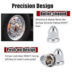 SIZE - Height: 2 2/5" (6cm). Fits 33mm Across Nut with Flange. Please check the size before purchase. HIGH QUALITY & ANTI-RUST - Our lug nut covers are made of solid stainless steel with a polished surface. The thickness is 2mm, which is not easily deformed by long-term exposure to sunlight. MAKE YOUR TRUCK SHINY - Our push-on spike lug nut covers were designed to cover up or hide the lug nuts on your truck wheels. They can also be used to DIY decorate your truck. They are chrome plated, have a high gloss surface. Give your truck a new cool look! ANTI-LOOSE - The push on 33mm stainless steel lug nut covers are firmly fixed to your wheel. Non-slip flanged design effectively prevents it from falling off. There will be no case of disappearing while driving. WHAT’S IN THE BOX - (ONE Pack of 20) Cabtherlyn Chrome Plastic Super Spike Push-On Lug Nut Covers. (NOTE: ONLY ONE SET will be on the order, if you need multiples, please order accordingly).