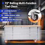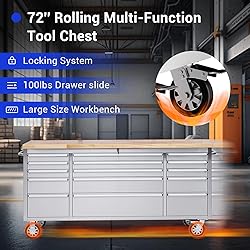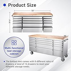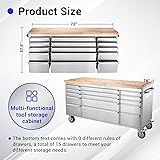 MORE STORAGE SPACE: This 72-inch tool chest on wheels has 15 drawers, 6 large and 9 small, and an 18-inch deep wood top that can be used to hold some of your more frequently used tools as well as an ideal workbench. EASY OPERATION: This big tool box with drawers includes pre-cut drawer liners that prevent tools from sliding when opening and closing the drawers. Each drawer is equipped with sliders for smooth and easy operation, but with a weight capacity of 100 pounds, it's ready for your daily use. LOCKED TOOL CABINET: Our professional tool cabinets are equipped with a lock and two keys, so you don't have to worry about losing your tools when you use them, and you can also prevent children from being curious and taking away tools, which can cause unnecessary property damage or injury. MOBILE WORK BENCH: This drawer tool box has four casters, two of which are with brakes, allowing you to easily move him to the position you want, while still being able to stabilize him. More convenient and efficient. MULTIPLE APPLICATIONS: This tool cabinet is made of high quality fingerprint-resistant stainless steel, which is not only durable but also easy to clean, suitable for garages, warehouses, workshops, repair stores and so on.
