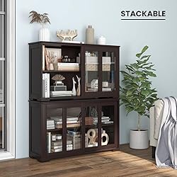 【Spacious & Versatile Storage Options】 The buffet sideboard features a generously sized top surface, perfect for holding appliances and other items. Additionally, the 2-door cabinet comes with a 3-position adjustable shelf, providing flexible storage options for different-sized kitchen supplies. The partition can also be removed to create a large storage shelf. 【Tough Sliding Tempered Glass Doors】 The cupboard stands out its solid tempered glass cabinet, which shows perfect performance in high strength and wear resistance. 2 sliding glass doors move smoothly on the bottom track, providing ample storage space for your kitchen supplies. 【Durable & Sturdy Construction】 The sideboard is made with thickened boards and features solid connections, ensuring excellent durability, increased sturdiness, and a longer lifespan. The stable support legs contribute to a reliable structure. The round corner design eliminates the risk of accidental injuries or damage. 【Stackable Cabinet for Widely Use】 You have the option to stack 2 cabinets together, providing flexible storage solutions while maximizing space efficiency. With its sleek lines and minimalist style, this kitchen storage cabinet complements any home decor, whether used in the kitchen. 【Assembly & Maintenance Guide】 All necessary accessories and hardware are included in the package for your convenience. The detailed instruction manual helps to shorten the assembly time. In addition, this cabinet requires minimal maintenance, saving you time and effort. Overall Dimensions: 42" x 13" x 25" (L x W x H).