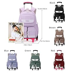 【Excellent Quality】: The Rolling backpack is made of high-density waterproof material to prevent accidental splashes. The inner material is composed of durable polyester, which makes the backpack durable. The sturdy material also extends the life of the pack. 【Large Capacity】: The backpack consists of a large capacity main pocket, a zippered sub-pocket, Three zippered front pockets and two side water cup pockets, the main pocket can store snacks, books, lunches and school supplies, and the sub and front pockets can store small object. The large-capacity design enables most children's daily necessities to be filled. 【Backpack size】: 12.7''x 7.0''x 18.8''(L*W*H)/32cm*18cm*48cm(L*W*H), suitable for elementary school students and short trips.Kids backpack suitable for different occasions, is a child's school, travel essentials. 【Choice of different wheels】2-wheels suitable for flat ground, 6-wheel design makes it easier to climb stairs; the trolley can be used separately; it helps your child reduce the burden. If your student doesn't want a trolley, just remove the lever and it becomes a regular school bag. 【Comfort】: The backpack with wheels reduces the burden of kids going to school and avoids back pain, this backpack is perfect for kids carry her school work around!