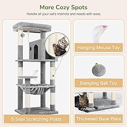Reasonable Path Design: The 53in tall plush multiple-level cat tower provides an cat playground for indoor cats to play through the unique layout of multi-layer platforms, connecting walkways and climbing structures. This design allows your cat to run, jump and explore, satisfying their curiosity and exercise needs Top Padded Platform Bed: The top perch bed (18.8" x 11.8") is soft and comfortable to sit on, and the height is moderate, which is very suitable for cats to watch, and it is also convenient for owners to interact with cats. The top cover of the bed can be removed for easy cleaning, ensuring that your cat always has a clean and comfortable resting environment Cat Condo and Hammock: The cat climbing tower combines a spacious cat cave (18.8" x 11.8" x 10.2") to provide privacy for your cat to rest and hide quietly, and a large hammock (17.7" x 14.5") that provides ultimate comfort and supports your cat's weight for stability Cat Scratching Posts and Toys: The cat scratching tree is equipped with 5 natural sisal rope cat scratching post, dangling plush balls and interactive mouse toys to satisfy your cat's scratching instinct and hunting desire. It not only relieves stress and protects your furniture, but also provides ample entertainment and exercise opportunities Easy to Assemble: Our cat condo house furniture comes with easy-to-follow step-by-step illustrated instructions and a full set of installation tools, which can be assembled easily and quickly without any professional skills or extra tools