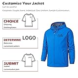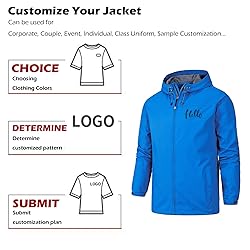 Personalized Jacket - Print with your own Pictures/Text/Logos on front and back of the lightweight jacket. Comes with 3 pockets. Waterproof - Made of waterproof fabric that keep you dry on moderate rain. Light weight rain jacket is easy to pack for outdoor activities. Windproof - Designed with full zipper, hood with drawstring, adjustable cuffs and mesh lining for great wind protection and more breathable. Occasion - Perfect for hiking, camping, riding, rock climbing, hunting, fishing, traveling, outdoor activities. Also great for group outdoor workwear. Group customization is accepted. For a looser fit, consider going a size up. If any problem with custom or size please contact us. We’ll happy to solve your request.