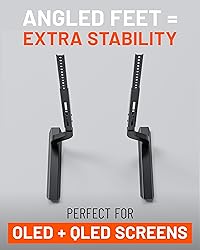 Meet our new show-stopping table top TV stand - the ultimate TV stand to keep your big TV secure, even in corners! With the power to hold up to 100lbs and screens from 55-85" this is the perfect universal TV stand for your new TV. Makes an ideal pair for QLED or OLED TV. Don't settle for a wobbly TV. Our TV stand mount boasts angled feet that bring extra stability to the table, making it perfect for your premium, thin screens like OLED & QLED TVs. Now there's no need to worry about your cat or tipsy friends knocking over your precious TV. At ECHOGEAR, we're all about happy endings - for your TV and furniture. With anti-slip and anti-scratch padding included, consider your gear extra protected from scrapes and falls. BONUS! We even include isolation pads for your soundbar to reduce vibrations. Streaming mount features versatile panel that securely hides small AV streaming devices and TV accessories behind TV. Just don't put your burner phone back there, we don't vouch for that. Device mount includes two hook and loop straps to secure accessory to panel. And no, the hook and loop is not a 4th down trick play.