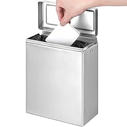 - FEATURES:Easy to clean:The stainless steel sanitary napkin receptacle is convenient and easy to maintain and clean, you just need to simply rinse them with water or wipe them down with a wild detergent to keep them sanitary and odorless.Storage case: This wall mounted bin doubles as a small trash can, perfect for tissues or other small bathroom waste, or as a handy storage container for sanitary goods or other small items.Versatile: The bin works great mounted to a wall or lined up on the floor, and they look great lined up together. The stationary space on the top allows for extra storage.SpecificationsMATERIAL: SUS 304 Stainless SteelCOLOR: BrushedSIZE: 10.2"Hx7.5"Lx3.75"D, 2.75LBSPACKAGE INCLUDES:1 x Sanitary napkins receptacle1 x Package of installation accessories