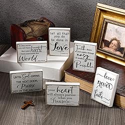 Meet Your Decoration Needs: the package comes with 6 pieces of rustic inspirational signs in the package in total, and they are available in 6 styles, each style has 1 piece, you can use them in a whole to decorate your tabletop, or display them in different places individually, rich amount also allows you to share with others Noticeable Size: each Christian home decor measures approx. 3.5 x 2.5 x 0.47 inches/ 8.9 x 6.35 x 1.2 cm, suitable size will not occupy too much space on your table or desk, nice for you to use at tiered trays or tabletop Rustic and Farmhouse Accent: these bible verse blocks are designed with many different quotes that from bible verses, along with the appearance of distressed white color, can perform well as incentive reminder, when people see the words on them, they will become full of energy Built to Long Last: the bible verse wood signs are made of quality MDF with clear printing, carefully polished and there is no burr, smooth in surface, not easy to break or deform, the color is not easy to fade, strong enough to accompany you for a long time under normal use Extensive Scope of Use: these religious wooden signs have a flat bottom, can be applied to many places, such as tables, shelves, windows, cabinet or other places, also you can use them for your living room, bedroom, kitchen and bathroom to add a warm atmosphere