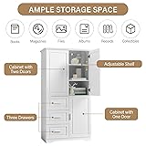Material - The main frame and the doors of this cabinet are made of high-quality MDF boards with painted finish. Importantly, the surface, feeling smooth, is water-proof and easy to clean. The door handle, hinge and drawer slide is made of metal, which is sturdy and durable. Ample Storage - Upper enclosed cabinet with doors has three tiers to accommodate decorations or articles for daily use. As for lower part, there are three big drawers on the left and one cabinet on the right to provide more storage space.You can put stuff in it, such as shampoo, towel, body lotion, tissues and storage basket etc.. Adjustable Shelf - The shelf can be adjusted up and down to different heights. Thus, this storage cabinet can hold different sized items, which totally satisfies different storage needs. Wide Application - This cabinet is widely applicable. You can put it in the bathroom or primary living room as a storage cabinet, kitchen as a pantry, and office as a bookcase etc.. Easy Assembly - The manual instruction and hardware (included anti-tipping device)will come along with the product. The illustrated description and logical steps are easy to understand and help users complete the installation faster.