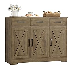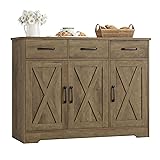 HOSTACK Modern Farmhouse Buffet Sideboard Cabinet, Barn Doors Storage Cabinet with Drawers and Shelves, Wood Coffee Bar Station for Dining Room, Kitchen, Living Room, Rustic Brown