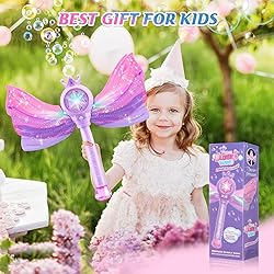 Dreamy Princess Design: Let your little one's imagination soar with the magical fairy tale design of the Bubble Wands. The pink fairy wand, crown, and detachable wings make for a stunning and enchanting toy that your child will love Fun Lights & Music: Elevate the magic to a new level with the Bubble Wands' flashing lights and musical sound effects. As your child waves the wand and watches the colorful bubbles float in the air, their faces will light up with joy and excitement Easy to Use: just pour the bubble liquid into the bottle of the bubble wand machine, install 3 AA batteries (batteries included), press the start button and easily create a magical bubble world that provides endless hours of entertainment for your child Safe and Durable: The bubble wands made from safe and durable ABS plastic. The bubble wands smooth edges and leak-proof bottle design ensure that your child can play without any worry of injury or mess Ideal Gift: Bubble Wands are a wonderful present for any occasion. Whether it's a birthday, holiday, or just a little surprise, these wands will enchant any child with their charming fairy tale design, along with delightful bubbles, lights, and music
