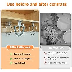 - This universal mixer attachment organizer is compatible with all KitchenAid mixer accessories with hanging holes (including Flex Edge Beater, Flat Beater, Dough Hooks, and Wire Whip)—please ensure your cabinet has enough space for proper installation and use—features 2 installation methods (use the included screws for stable mounting or peel off the adhesive tape on the bottom to stick it on cabinets or other flat surfaces, choosing the suitable option based on the installation surface), is made of heavy-duty plastic that is small in size, lightweight yet strong with excellent load-bearing capacity to sturdily hold various mixer attachments, saves kitchen space and keeps accessories tidy while allowing quick access to stored beaters and tools, and includes 4 independent holders that can be reasonably allocated and installed according to your kitchen space to eliminate clutter and prevent missing any accessories—making it a practical and great storage tool!