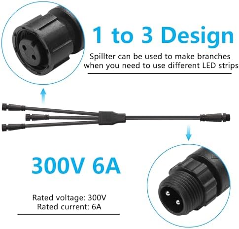 - 【Features】Package contains: 1 * 2 wire 1 male to 3 female waterproof connector cable. Cable total length: 50cm. Main wire gauge: 17AWG(2* 1mm² pure copper wire core). Branch wire gauge: 18AWG(2* 0.75mm² pure copper wire core).Rated voltage is 300V and the rated current is 6A.