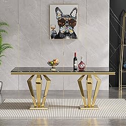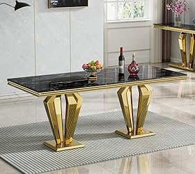 ➤Luxurious & Modern Dining Table: With a luxurious look and creative ultra modern design, this beautiful large marble dinner table will fit perfectly with any home decor. The combination of faux marble top and stainless steel pedestal makes this luxury kitchen dining table a perfect element to bring you the art of visure and complete the streamlined modern luxurious look in your home. ➤High Gloss Black Top: All our dining tables are made with the highest quality materials, guaranteeing durable and functional furniture. Rectangular dining table of luxurious design with fixed 0.71" printed marble top and smooth edges, is ideal to combine with the latest trends in decoration. The smooth surface is easy to clean and can help you save a lot of time and effort. ➤Sturdy Stainless Steel Dining Table:The base of this large dining table is made of stainless steel and gold mirrored finish, which ensures the stability of the dining table, not as fragile as the wood dining table, load bearing can reach 500 pounds. Unique marble dining table offers a geometric beauty, to bring the elegance and avant-garde style to your kitchen, living room, or dining room. ➤Multi-Purpose of Marble Dining Table: Contemporary dining table measures 68"L x 33.85"W x 29.9"H. Versatile and functional, its rectangular printed marble top offers that feeling of spaciousness and light that you are looking for in your home. Our modern marble table can be used in office, store, kitchen, dining room, living room, guest room or bed room as a dining table, living room table, coffee table, office computer desk or conference table. ➤Easy Assembly and Premium Customer Service: Two packages with all screws, tools, and manuals. Installation is simple and fast by following the instructions, which can be finish in just 15-25 minutes. Please protect the tabletop to avoid breaking it when you are assembling the dining table. Any questions please feel free to contact with us first, we will provide replacement if you need.