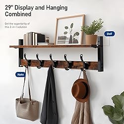 No 【29inch Large Wall Shelf Storage】2 in 1 wall hooks with shelf have functions both hang & display; The shelf for wall wide enough to display books, frames and vases; Suitable for living room,laundry room,bathroom and kitchen, etc. 【80 lbs Super Bearing Capacity】Combining sturdiness and beauty, the upgraded wall mounted coat hook are thicker and stronger, supporting up to 80 lbs, crafted from premium metal for long-lasting durability 【Wall-mounted Aesthetics】 This wall mounted coat rack with shelf frees your ground space, decorates your walls while maximizing your living area 【Entryway Wall Organization】 Use it as an entryway coat hanger wall mount; All on-the-go essentials are at your fingertips-keys, bags, hats, and more.Not only keeps your space organized, but also you don't have to look around for things when you go out 【Rustic Charm & Timeless Style】Our rustic brown wall shelf with hooks features a premium MDF board with clear wood texture and robust black metal hooks, offering functional convenience while seamlessly complementing any room decor