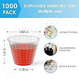 Pack of 1000 : The medicine cups are sold in a pack of 1000. What a cost-effective option! Each item includes 5 sleeves, with 200 measuring cups (1 oz) in each sleeve. The bulk pack of 1 oz measuring cups can cater to both personal and professional needs Accurate : Each 1oz plastic medicine cup is engraved with precise measurements on the side, including five units of TBS, OZ, DRAMS, CC, and ML. These medication cups are perfect for accurately dispensing prescriptions and ensuring quick patient compliance Easy to Read : Our 1oz measuring cups are sturdy and durable. The measurements are embossed on the exterior of the cups, making it easy to scrape off the sides for taking out or mixing. Also enable measuring and reading while still maintaining clarity Hassle free : Disposable measuring plastic cups can use for medical purposes as multiple pill intake, liquid medicine dosage measuring. Dispense liquid or solid medications in a hygienic way. And there is no need to clean to maintain hygiene Multi-purpose : 1 oz medicine cups can easily used to measure out precise quantities of spices or other ingredients for cooking. Even can be used in DIY arts & crafts projects like epoxy mixing, painting mixing, resin mixing and more