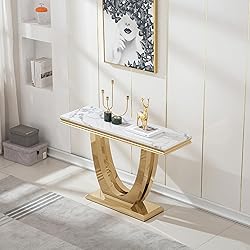 - Modern 47 inches Console Table Rectangular Faux Marble Entryway Table with Mirrored Stainless Steel Base This stylish console table is perfect for bringing an air of modern style to your Hallway Corridor Living Room. Modern and elegant smooth faux marble tabletop, beautiful and waterproof, easy to clean. U-Shape base is made of mirrored stainless steel, boasting clean lines, chic accents and a striking silhouette. Besides Entryway Console table, It can be display table, coffee table, presentation table, etc. A good choice for family meeting or parties. Specification Color: White Faux marble top, Gold base Materials: MDF, Stainless Steel Table Dimension:46.85''L x 14.96''W x 30.5''H Table Net Weight(pc): 65 lbs Weight capacity hold up to 200 lbs Package includes: 1 x Console Table