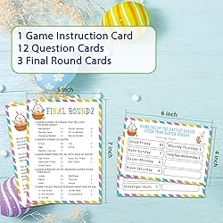 There are 16 cards in the package including 3 game instruction cards + 12 question moderator cards and 3 quick final rounds game cards. This is a Easter theme feud game which is perfect to liven up your Easter party. It requires a host who can grasp the scene, read the questions, reveal the answers, and reward points. Detailed game instructions are included in the package. Enjoy the game and have some fun together with your families on your Easter party! All cards are printed on eco-friendly premium paper for a perfect gaming experience. Please feel free to buy.