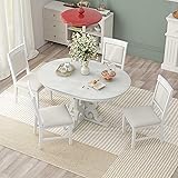 Retro Dining Table Set: The retro functional dining set comprises one extendable dining table and four matching upholstered chairs, blending understated elegance with a rich vintage feel. The table legs and backrests of the chairs feature symmetrical hollowed-out carving patterns. Extendable Kitchen Table: The round dining table features a 16-inch removable middle leaf to create an oval dining table of varying lengths for seating up to 6 people. The total length of the dining table is 58 inches, with the middle leaf removed the length becomes 42 inches. You can insert or remove the leaf as needed, switching the table back and forth between round and oval. Exquisite Dining Set: Our wooden dining table has a smoothly-painting tabletop and pedestal legs. In the design of the meticulous and gorgeous symmetrical curved pattern, the table is full of a retro flair. Moreover, the exquisite chair backrests featuring hollowed-out patterns and metal decorative nails greatly add vintage flair to your home decor. Wood Dining Room Table Set: The tabletop is made of high-quality MDF with ash veneer, which is smooth and durable. The legs of the table and chairs are made of solid wood LVL, which is strong enough to support you and your family. All four chairs are wrapped in linen as the seat cushion and filled with soft foam to provide a comfortable sitting experience. The thickness of the chairs is 60mm. Easy To Assembly: This product comes with detailed instructions, and it can be installed step by step following the instructions, which can help you complete the assembly as soon as possible.