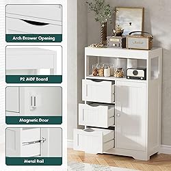 - Do you suffer from a lack of storage space in your bathroom? When there is no place to store your toiletries, you can consider our bathroom cabinet. This Wooden Bathroom Cabinet with Adjustable Shelves is suitable for both storage and display.With P2 MDF and metal hardware, selected materials ensure that this storage shelf will last for a long time. The floor cabinet features adjustable shelves, making it easy for you to place items of different sizes. Our bathroom cabinets can be used in more than just the bathroom. Our bathroom cabinets come with a door and three drawers with adjustable shelves inside the door, so you can use them in your living room, kitchen, hallway or office as needed. Features: - Multifunctional corner unit with 3 drawers and 1 door with adjustable shelf to keep your room organized; -Anti-tipping device for extra safety; - Made of sturdy wood with painted finish for long life; -Magnetic door makes it easy to open and close, protecting items inside. - Equipped with moisture-proof coating process, easy to clean. - Ideal for bedrooms, laundry rooms, living rooms, hallways, closets, etc. Specification: Color: White/Brown/Grey Material: MDF (Medium Density Fiberboard) Product Size: 22.1”D x 11.1”W x 34.1”H Open Shelf Size: 20.9”D x 11.1”W x 6.5”H Inner Size of Drawer: 9.6”D x 10.6”W x 8.6”H Product Weight: 31.97 lb (14.5kg)