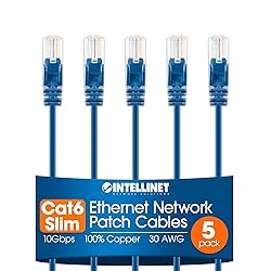 Intellinet Slim Cat6 Ethernet Network Patch Cable – 5 Pack - 10Gbps & 250MHz, Snagless Boot, 30AWG Pure Bare Copper Wire, Gold-Plated Contacts, Lifetime Mfg Warranty - 25ft, 5 Pack, Blue
