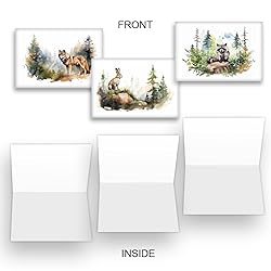 WATERCOLOR MOUNTAIN WILDLIFE BY WRIGHT HOME & GIFT (NOTE0177) – Cover Reads: **No Text**; Inside Reads: **No Text** 10 PACK ASSORTMENT BULK VARIETY SET + 10 ENVELOPES – This all-occasion blank note greeting card design features unique art and a quirky quip. A perfect way to show you care. SIZED FOR STANDARD POSTAGE RATES – Card size is 4x6 inches, with an equal number of matching-sized envelopes for mailing. Standard postage rates apply, and should not require additional postage, beyond a standard postage stamp. HIGH QUALITY PRINTING ON SUSTAINABLE CARDSTOCK – Each Wright Home & Gift greeting card is printed on 300 GSM semi-gloss card stock sourced from well-managed forests, and utilizes print-on-demand technology to reduce waste. Inside of card is uncoated for best writing results, with plenty space for a nice personal message. DESIGNED AND PRINTED IN THE USA – Wright Home & Gift founder and creator Tim Wright is a regular at small town flea markets, barn sales and creaky floor board antique shops, hunting down one-of-a-kind visions of the past. His designs are homegrown in the Pacific Northwest, and printed in upstate New York. Made in America is how we do things!