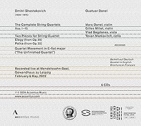 - With their recording of Dmitri Shostakovich's complete string quartets, the Quatuor Danel has crafted an impressive opus that delves into the composer's life with deep musical understanding and establishes unparalleled standards in interpreting his chamber music. These new live recordings, stemming from their 2022 residency at the Mendelssohn Hall of the Gewandhaus Leipzig, capture the full spectrum of emotions embedded in Shostakovich's quartet cycle, from the ethereal to the profound, from the whimsical to the contemplative. With their interpretation of this extraordinary cycle, the Quatuor Danel has forged a distinctive Shostakovich style that cannot be found in any other quartet. Primarius Marc Danel reflects on the resonance with the audience in Leipzig, describing it as nothing short of sensational. "I hope the recordings will also convey the collective spirit we permanently felt during our residency in the Mendelssohn Hall."Recorded live at Mendelssohn-Saal Gewandhaus zu Leipzig February & May, 2022